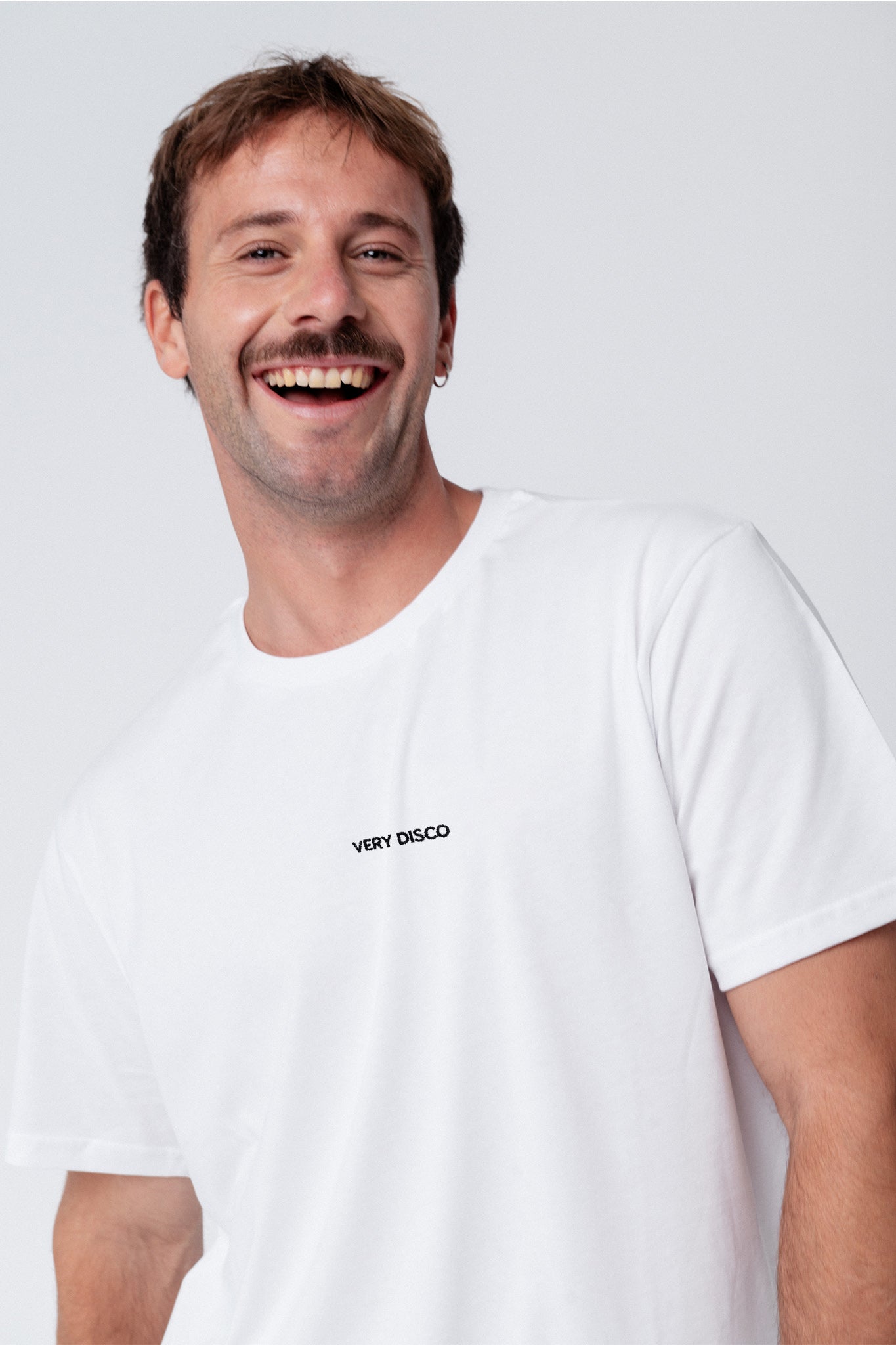 Besticktes Bio Baumwoll Unisex T-Shirt mit schwerem Stoff (190gsm) und gesticktem VERY DISCO Schriftzug