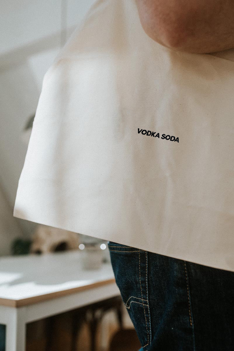 Bolsa de algodón orgánico bordada, de producción justa, con la inscripción VODKA SODA.