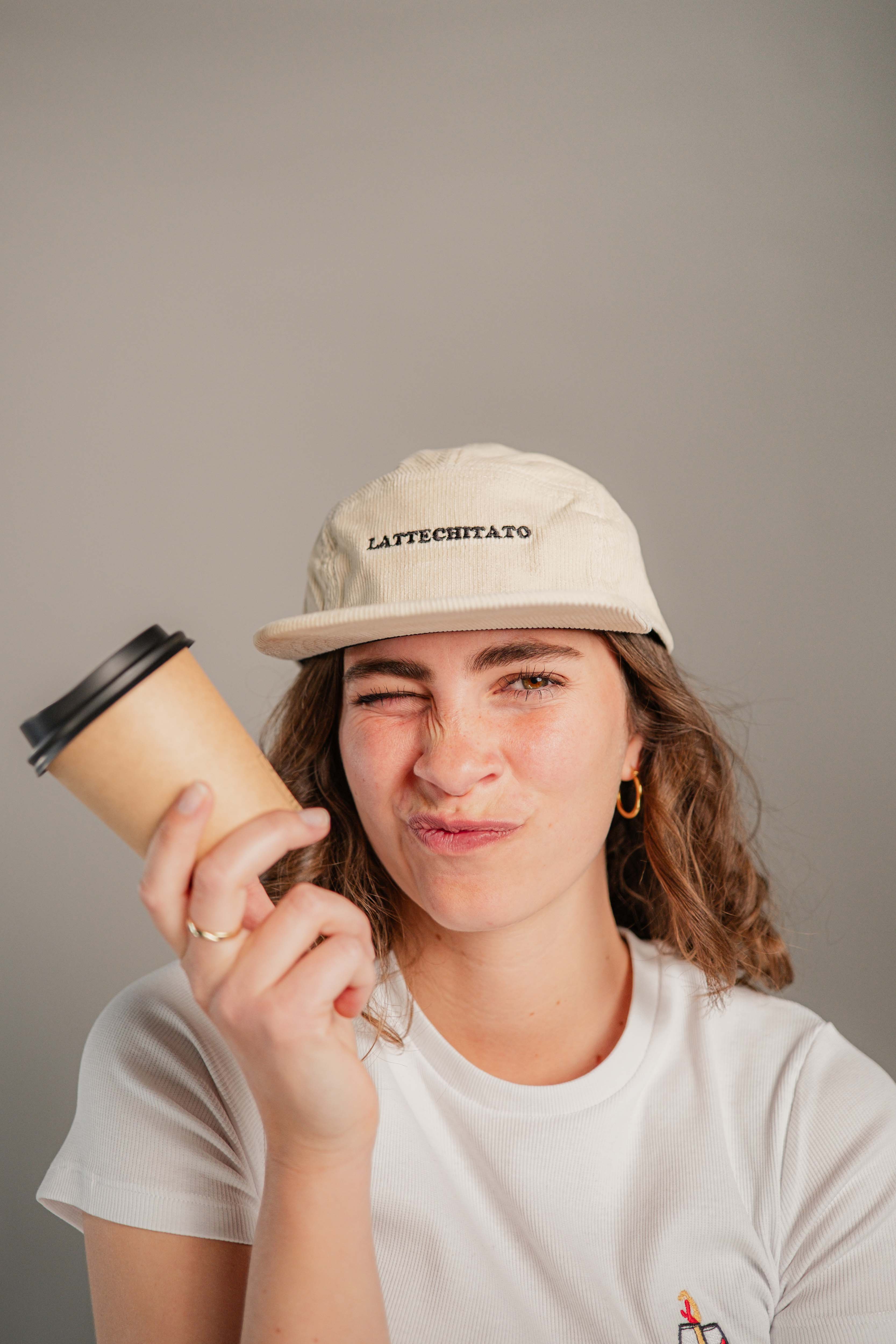 Super hochwertige Cord Cap aus 100% Bio Baumwolle mit gestickten "Lattechitato" Schriftzug vorne und kleinen gestickten  Siebträger seitlich
