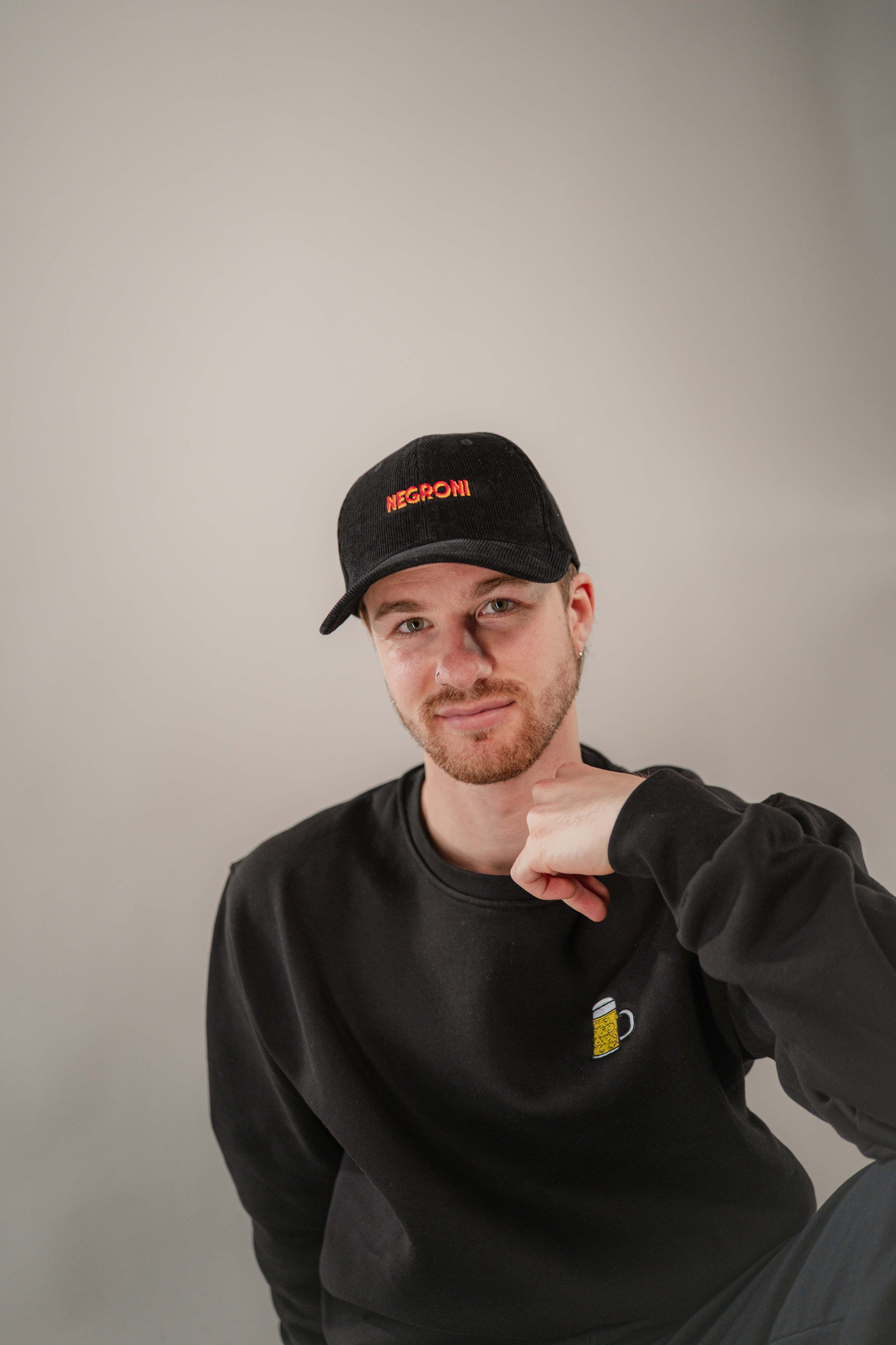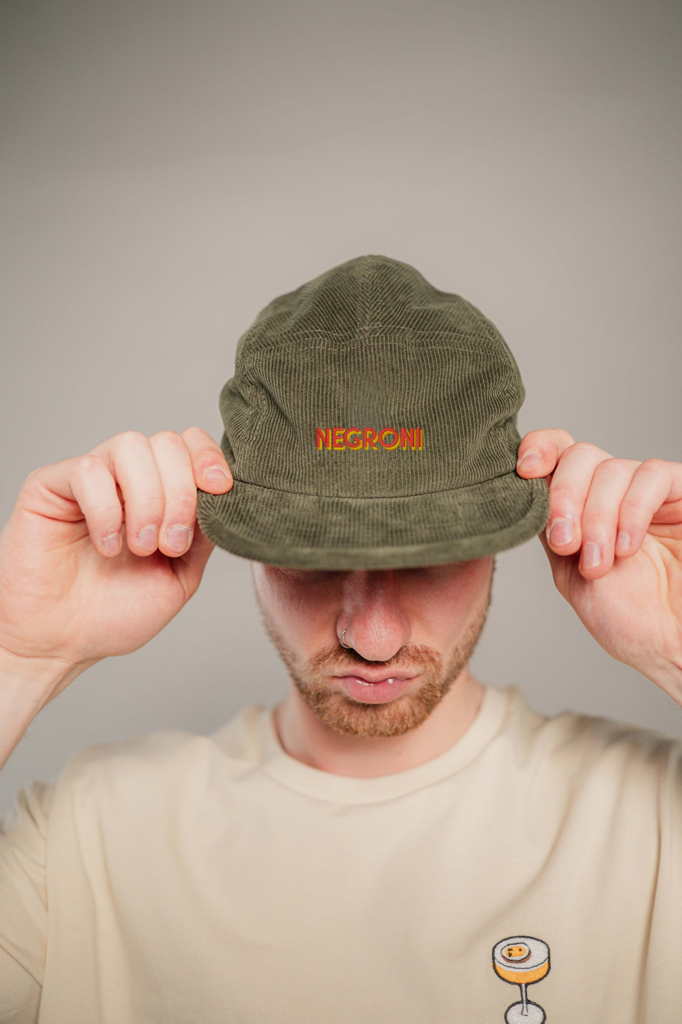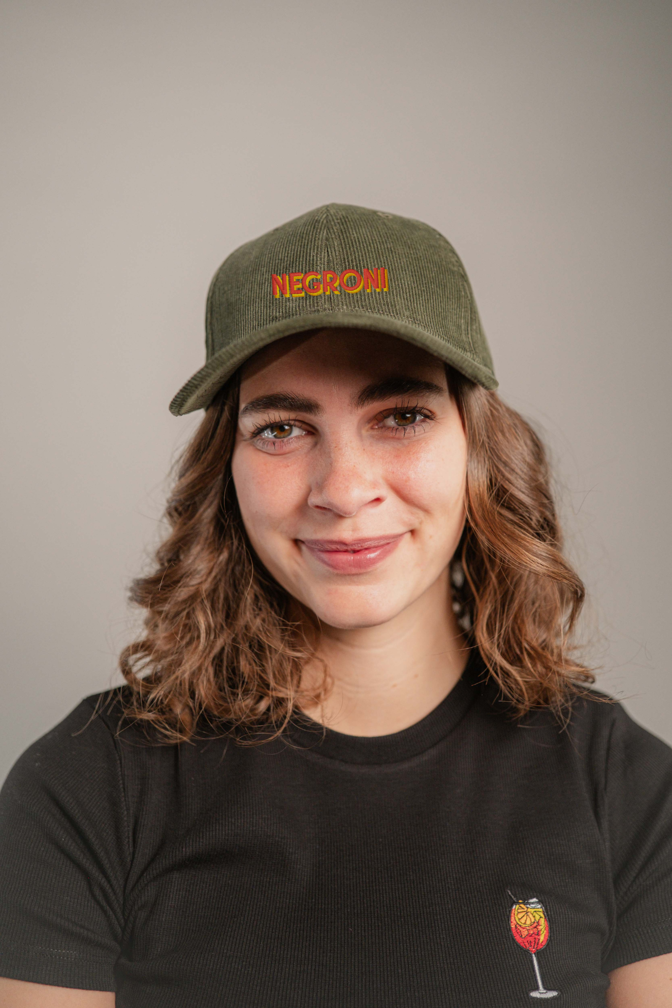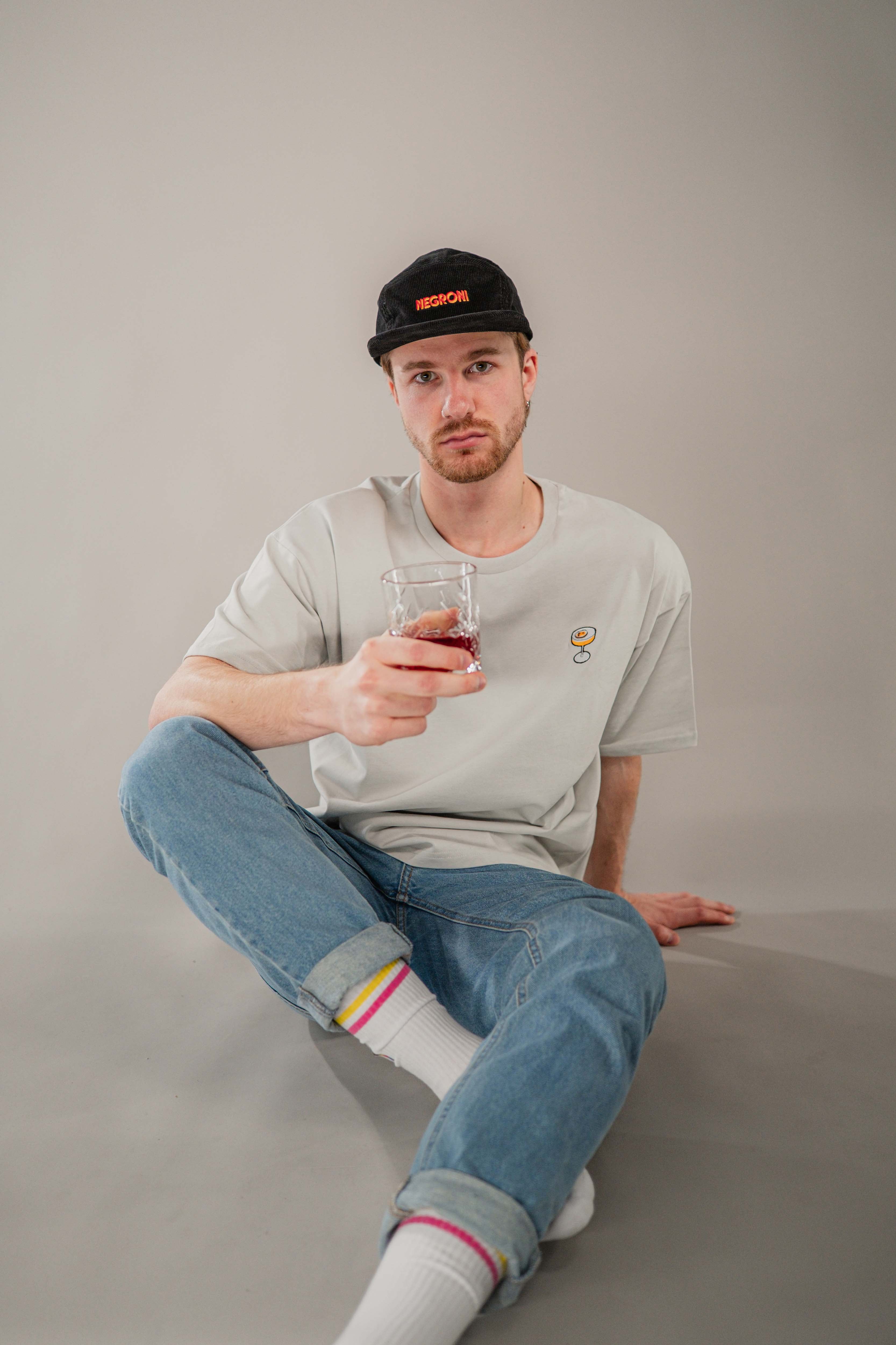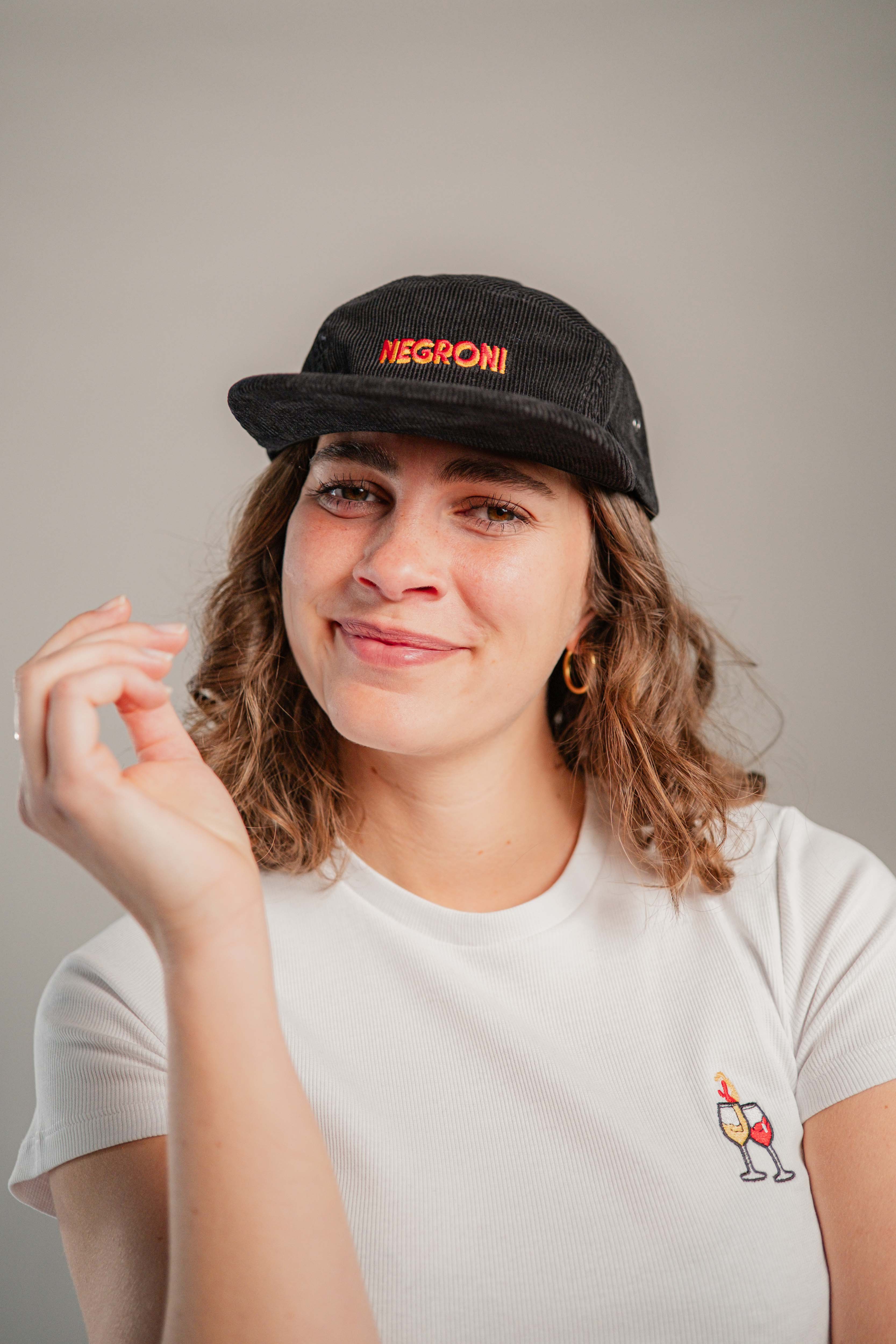 Super hochwertige Cord Cap aus 100% Bio Baumwolle mit gesticktem Negroni Signature Schriftzug vorne und kleinem gesticktem Negroni Tumbler seitlich
