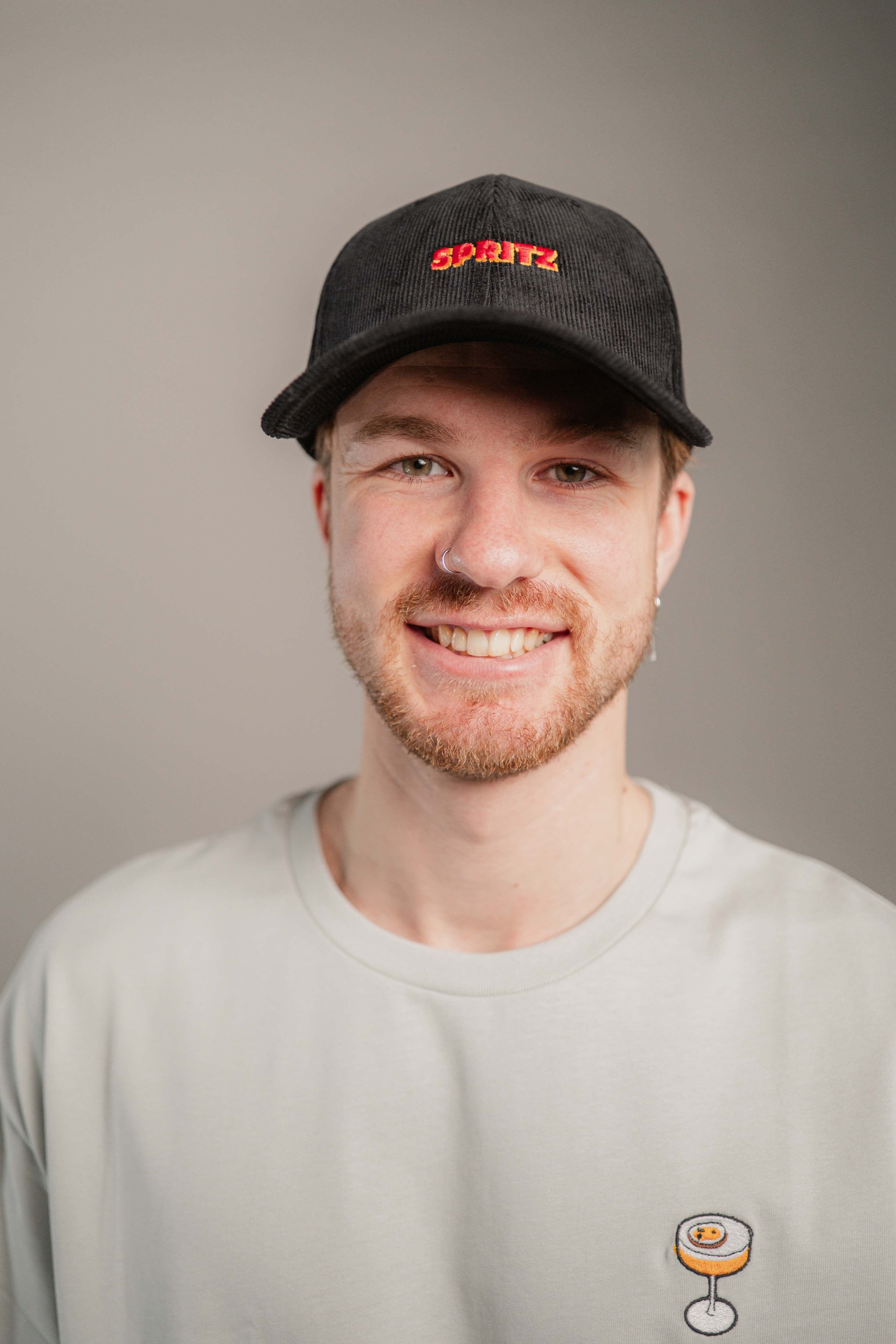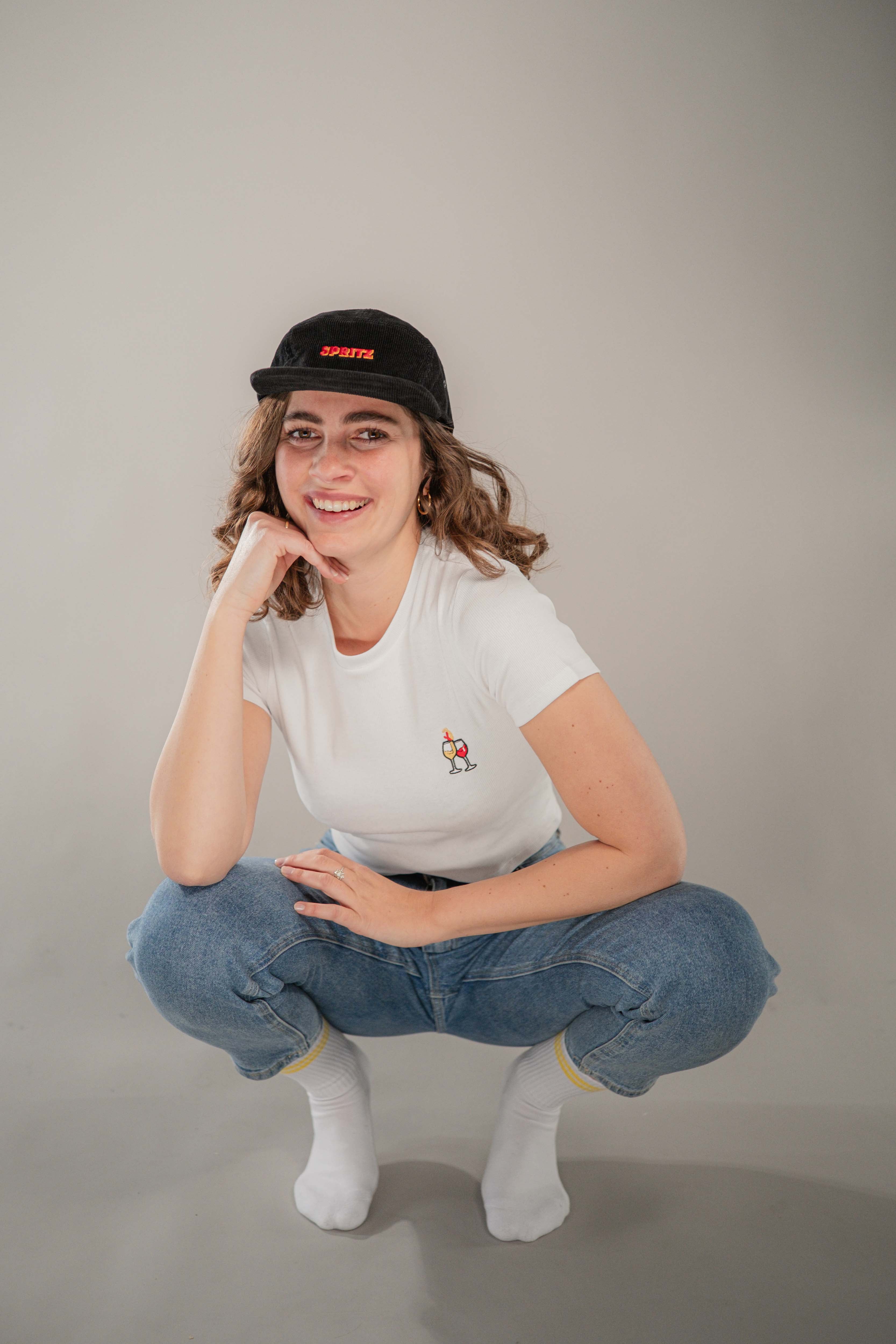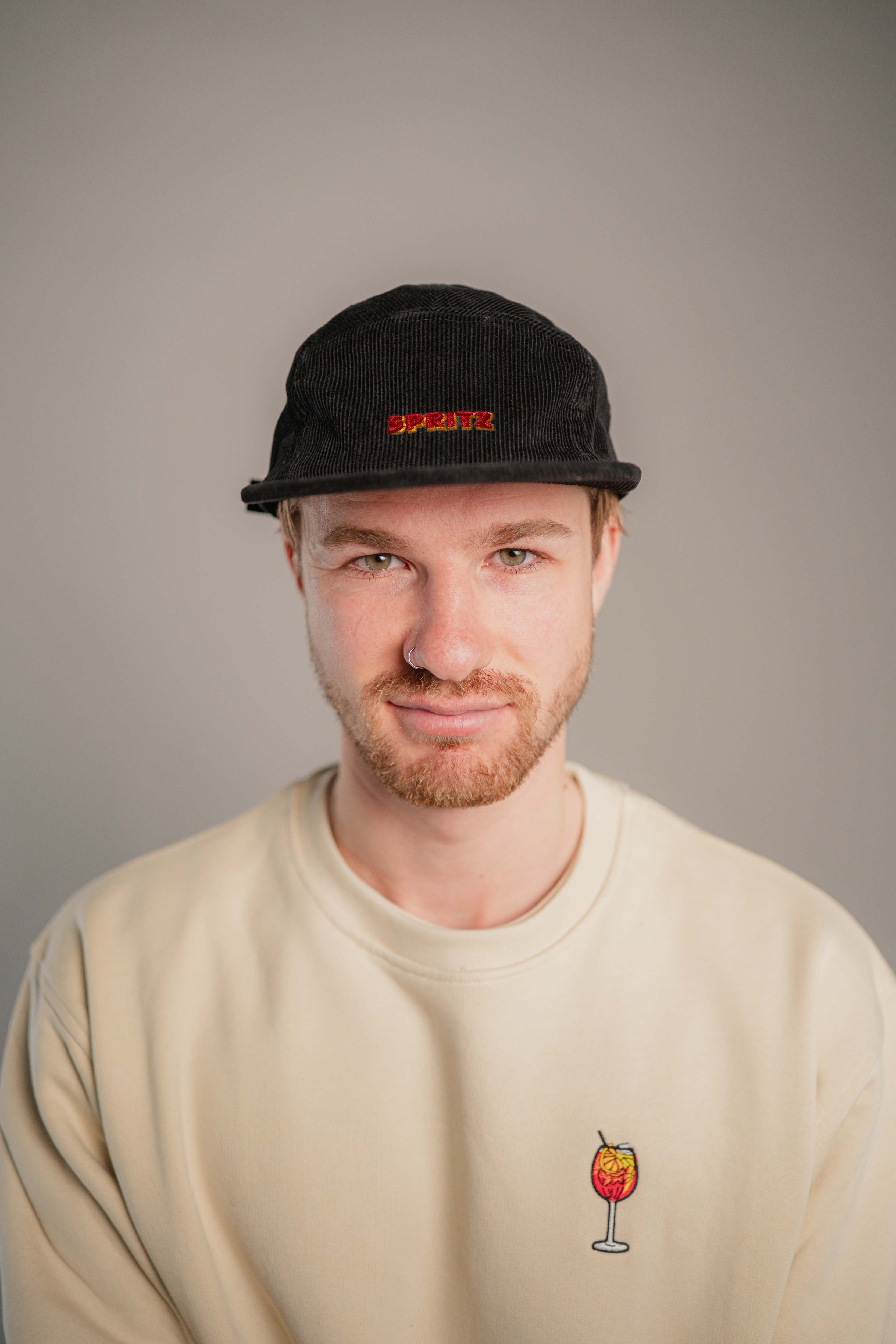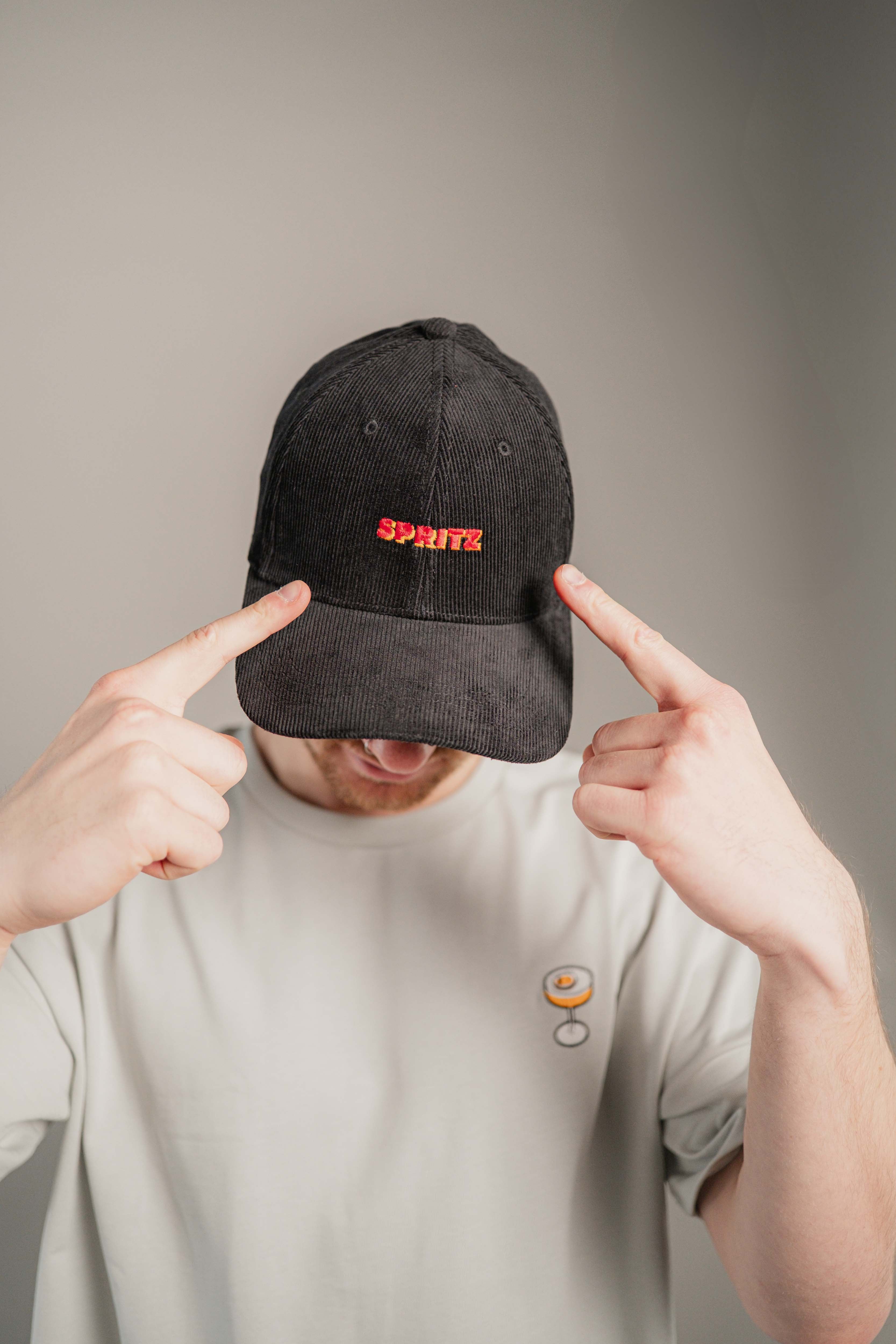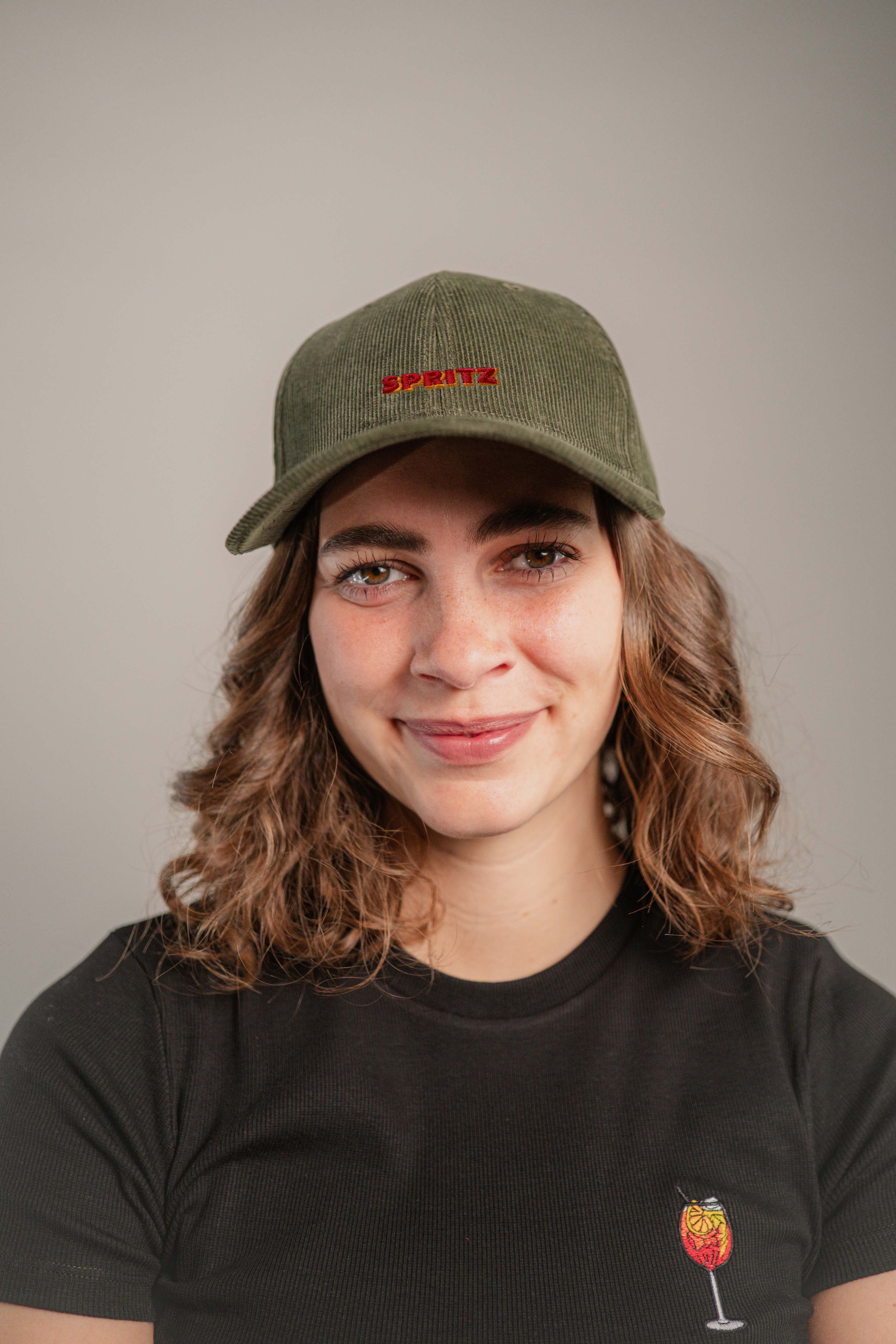 Super hochwertige Cord Cap aus 100% Bio Baumwolle mit gesticktem Spritz Signature Schriftzug vorne und kleinem gesticktem Spritz Glas seitlich