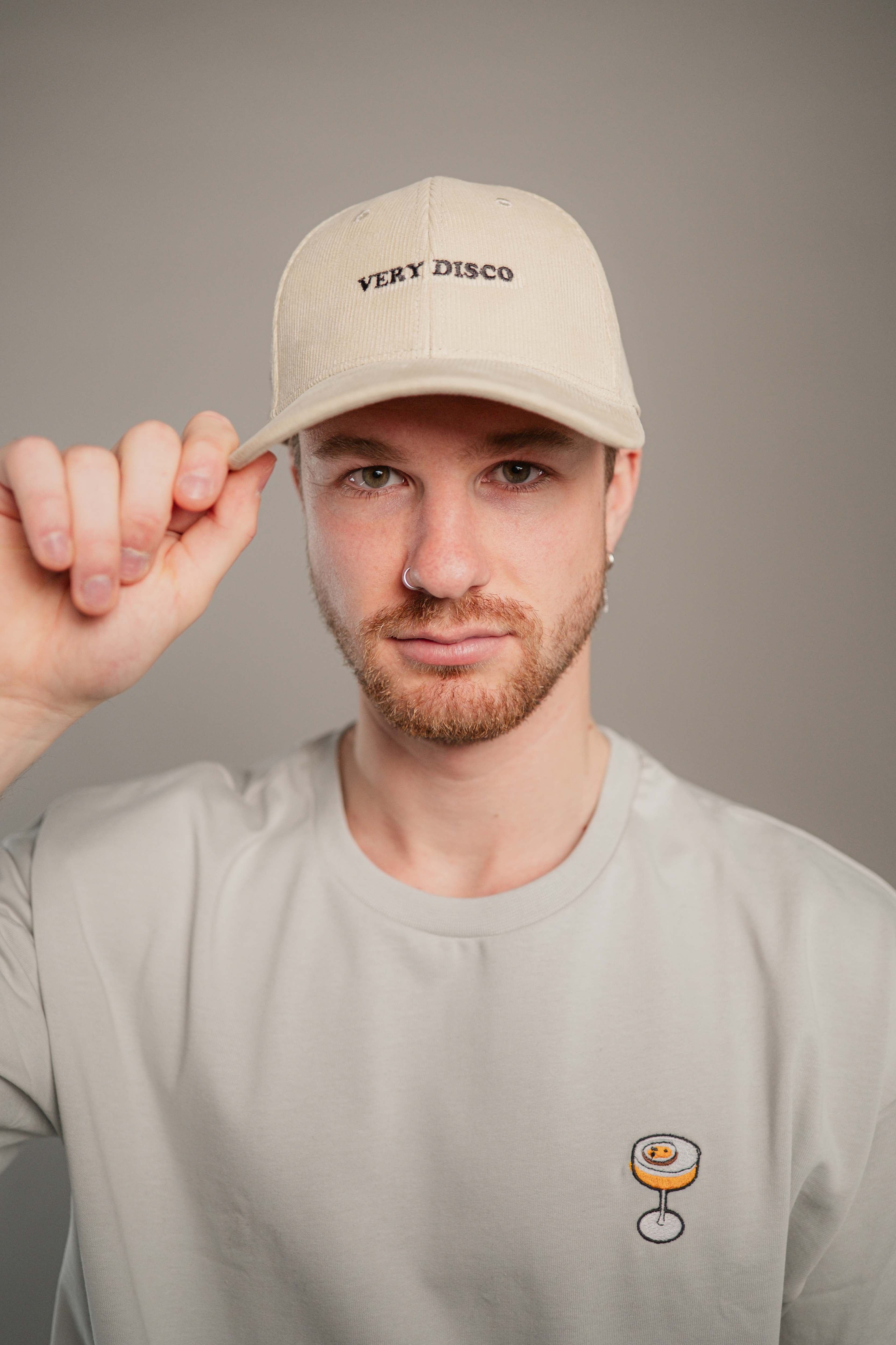 Super hochwertige Cord Cap aus 100% Bio Baumwolle mit gesticktem Very Disco Schriftzug vorne und kleiner gestickter Discokugel seitlich