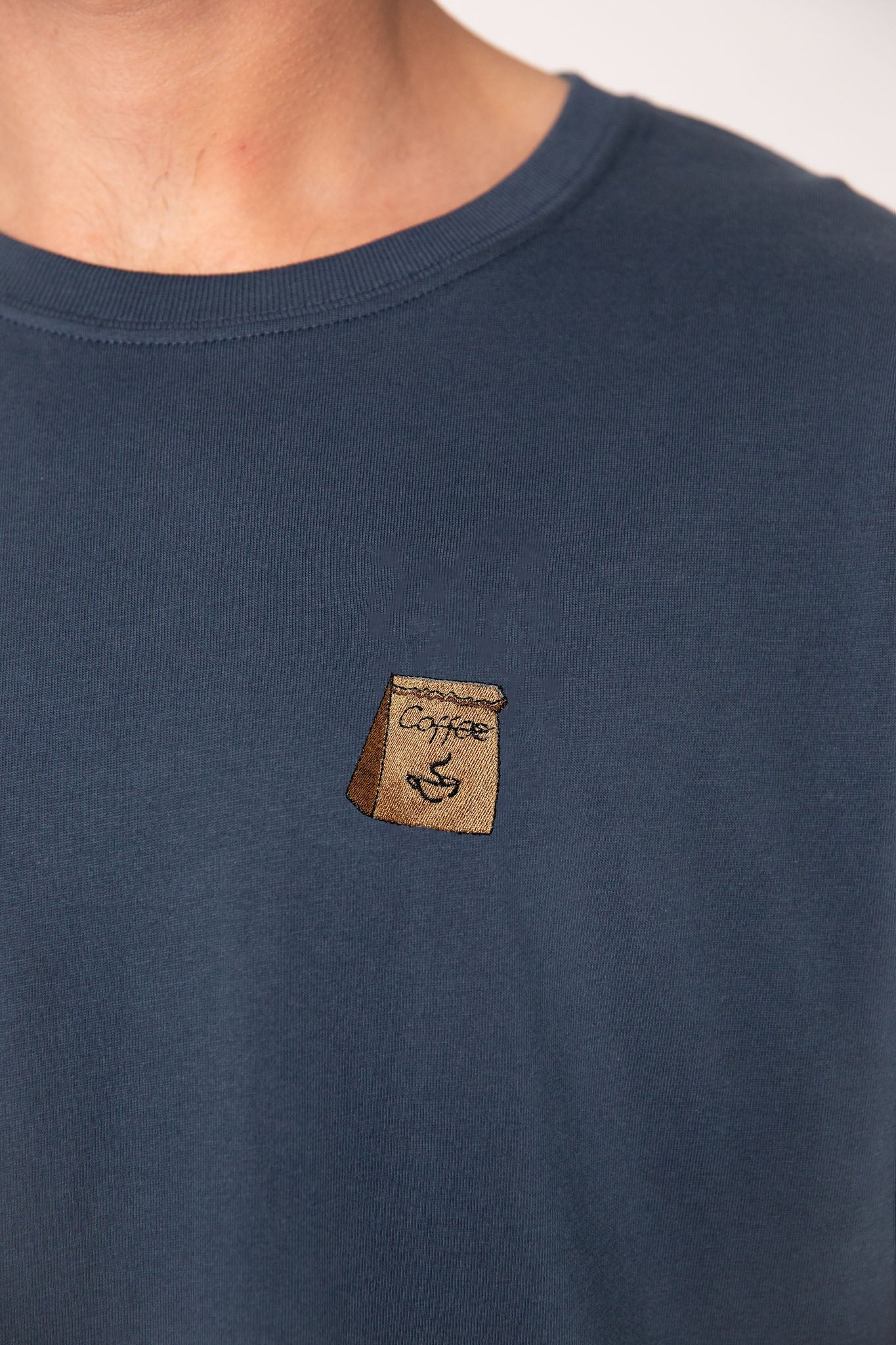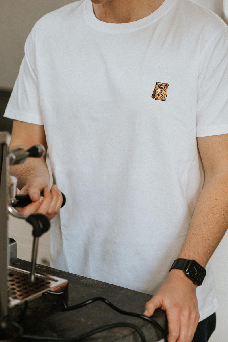 Super hochwertiges Bio Baumwoll Unisex T-Shirt mit schwerem Stoff (190gsm) und gesticktem  Coffee Bag Design