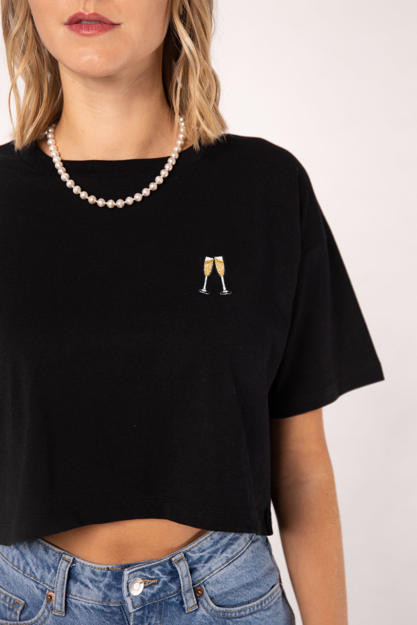 Super hochwertiges Bio Baumwoll Cropped T-Shirt mit gesticktem Sekt Design in drei verschiedenen Schnitt-Varianten: Ripped, Regular & Oversized