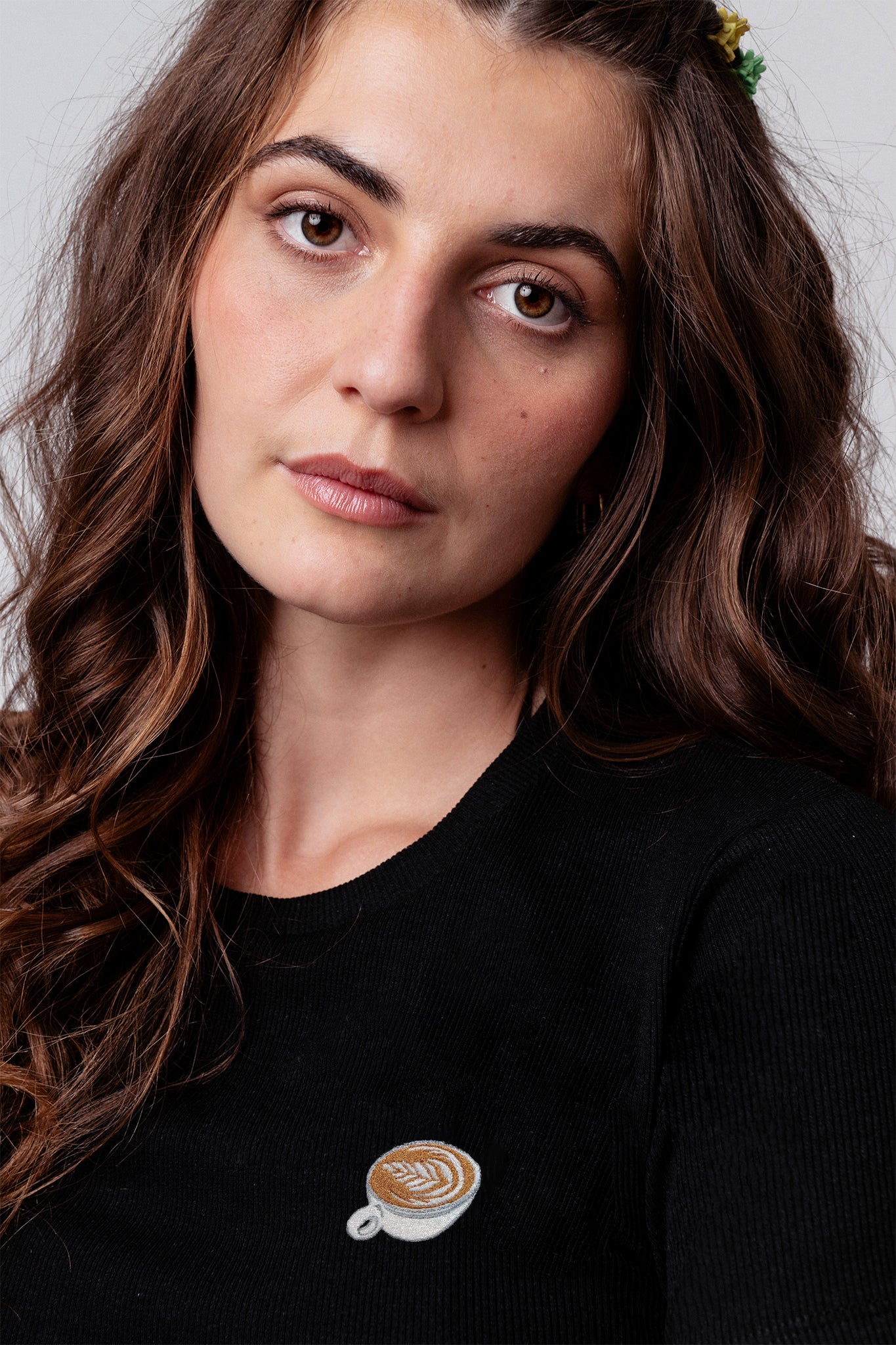 Super hochwertiges Bio Baumwoll Cropped T-Shirt mit gesticktem Flat White Design in drei verschiedenen Schnitt-Varianten: Ripped, Regular & Oversized