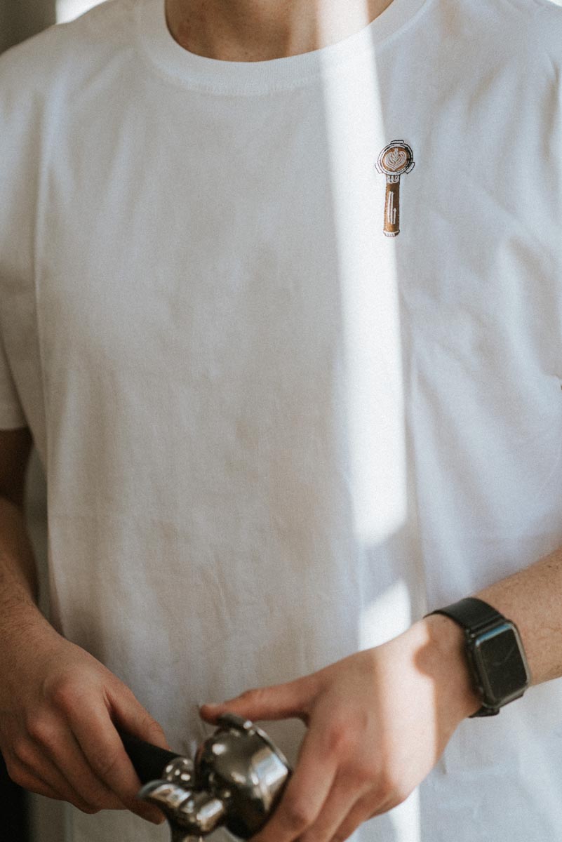 Super hochwertiges Bio Baumwoll Unisex T-Shirt mit extrem angenehmen Stoff (190gsm) und gesticktem Siebträger Latte Art Design