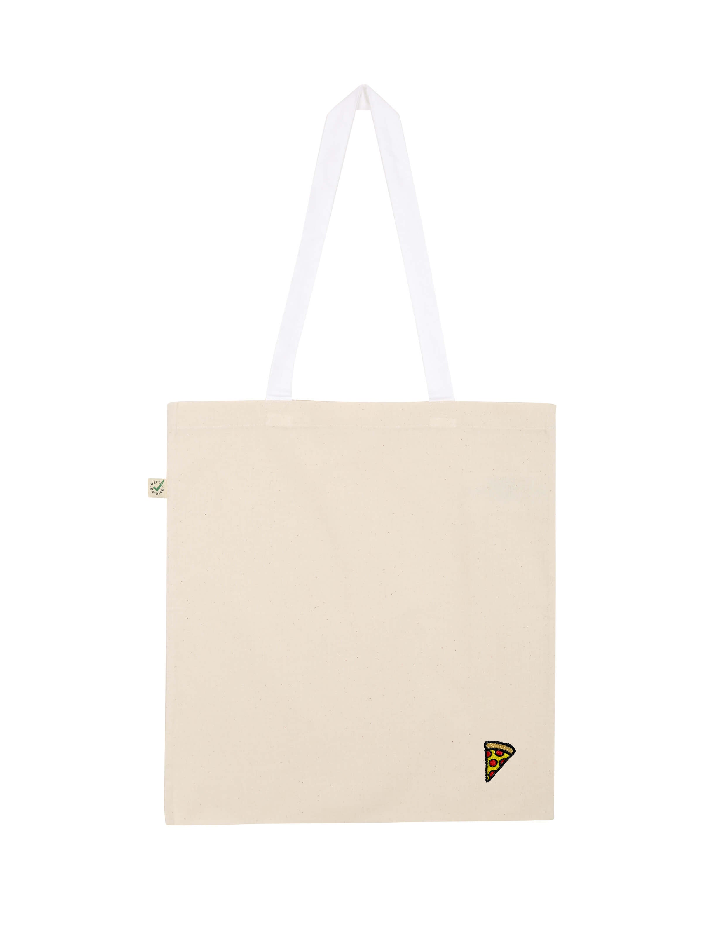 Bestickte, fair produzierte Bio-Baumwoll-Tragetasche im Pizza Design.
