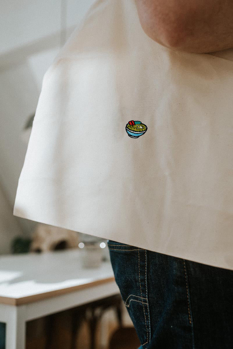 Bestickte, fair produzierte Bio-Baumwoll-Tragetasche im Ramen Design.
