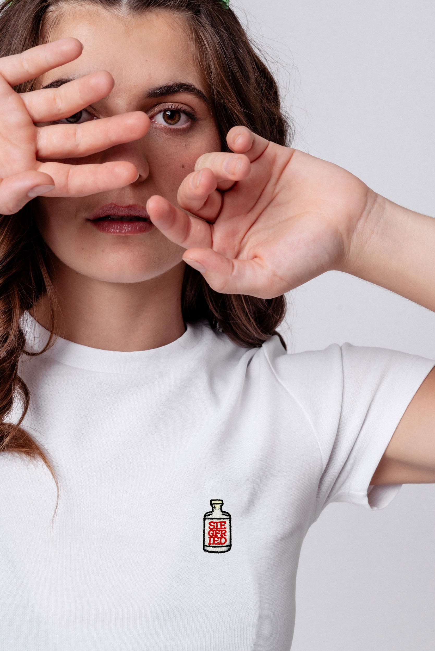 Super hochwertiges Bio Baumwoll Cropped T-Shirt mit offiziell gesticktem Siegfried Gin Design in zwei verschiedenen Schnitt-Varianten: Ripped, Regular & Oversized