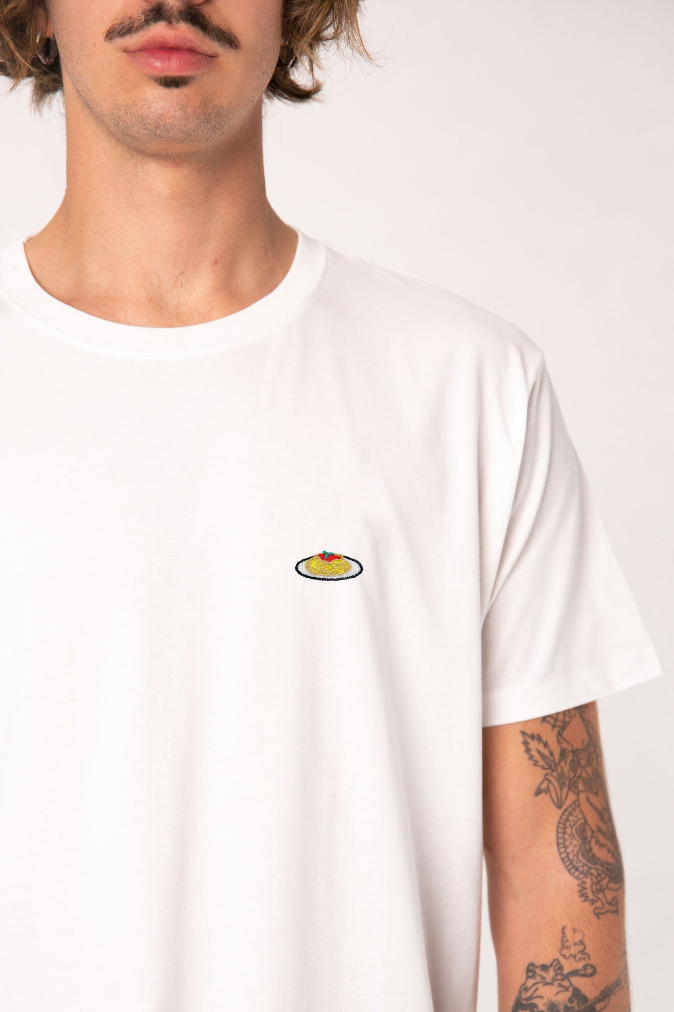 Besticktes Bio Baumwoll Unisex T-Shirt mit schwerem Stoff (190gsm) und gesticktem Pasta Design